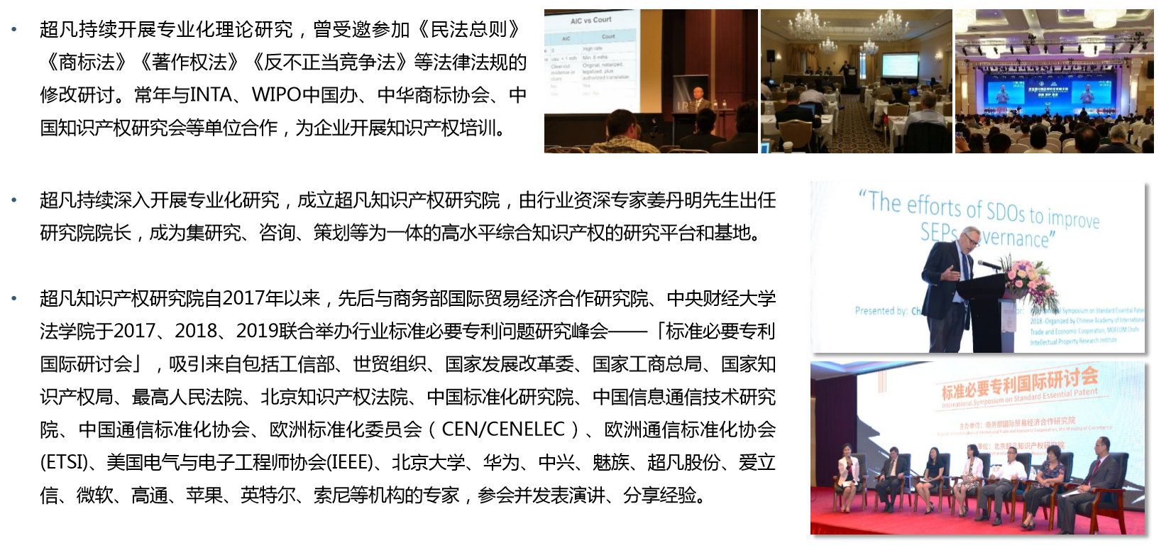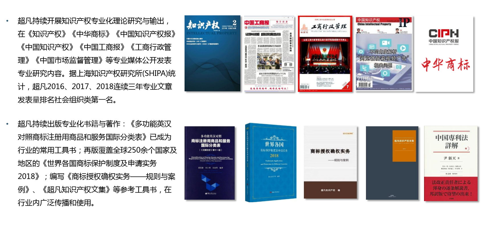 超凡拥有国内综合型知识产权专家团队,专利代理人/工程师、律师、咨询师、商标代理人等各类专家800余人,其中包括清华、北大、中科院博士在内的100余名多技术领域检索咨询专家团队,其成员大多具有10余年从业经验,全国专利信息人才6名;专利代理人/工程师440余人,而且50多人具有律师及专利代理人双重资格、海外留学背景或审查经验;超凡专家团队中,还包括亚洲知识产权专家、北京市十佳专利代理人等。 随着专业化建设的不断深入,超凡凭借深厚的实务经验及卓越的服务品质,铸就了多项典型案例,如成功代理的倍受社会各界关注、涉及37个异议主体、有史以来涉案主体数量最多的“国酒茅台”商标异议案,“拉杆箱”外观设计专利权纠纷、“男士”商标侵权纠纷等案件入选全国法院知识产权典型案例或专利复审委典型案例。同时,超凡不断强化学术建设,把理论研究作为“深化专业化”的有力支撑。在上海知识产权研究所发布的“2016年度知识产权专业文章发表排行榜”中,超凡发表专业文章数量在社会组织机构中排名第一。
